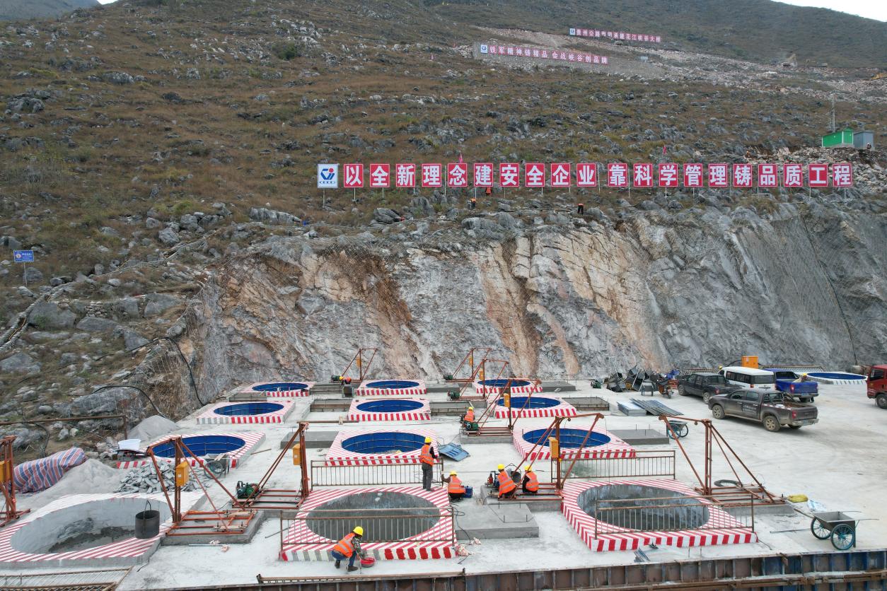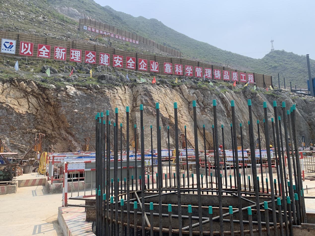 大桥六枝岸主塔地处陡峭斜坡,自然坡度30°-45°,地形复杂,岩溶发育,施工区域严重缺水,传统机械钻孔易卡钻。项目团队创新采用“人工挖孔+传统干桩+导管浇筑”施工工艺,利用“人工+机械”进行干法挖孔,避免了传统湿法钻孔中需要大量水循环冷却和环境污染的问题;挖孔完成后,通过导管进行混凝土浇筑,确保桩基的质量。“人工挖孔+传统干桩+导管浇筑”施工工艺不仅有效解决了场地受限、缺水、环境保护等难题,还提高了施工效率,保证了桩基的施工质量。
