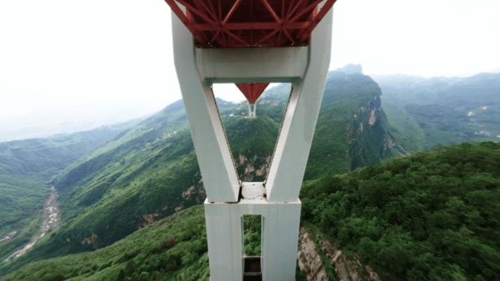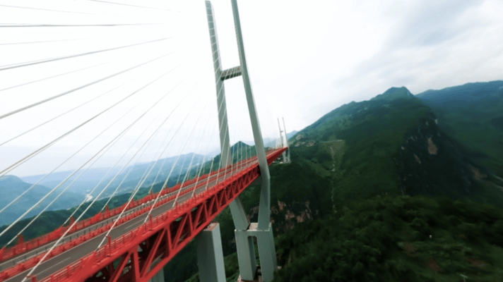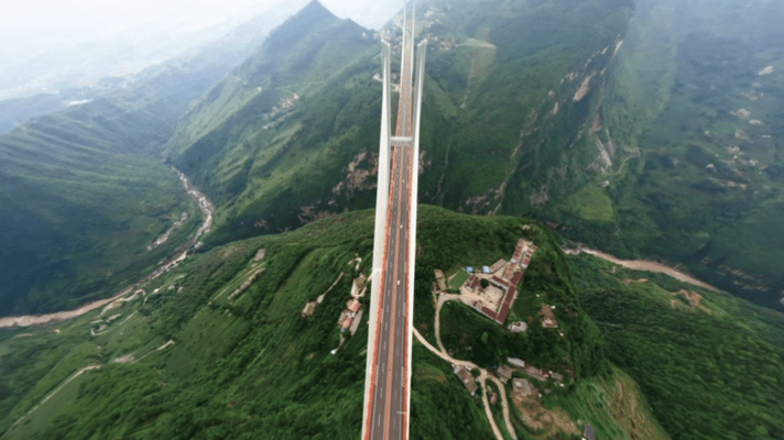 杭瑞高速北盘江大桥位于贵州省六盘水市水城县都格镇,横跨云贵两省交界处的北盘江大峡谷。桥梁全长1341.4米,桥面到水面垂直高度565米,相当于200层楼高,是目前世界第二高桥。峡谷两岸地势陡峭,地形起伏大,施工技术难度大。北盘江大桥云南岸由贵州公路集团承建,于2013年9月24日开工,2016年12月29日建成通车。建成时为世界第一高桥、第二大跨径钢桁梁斜拉桥。