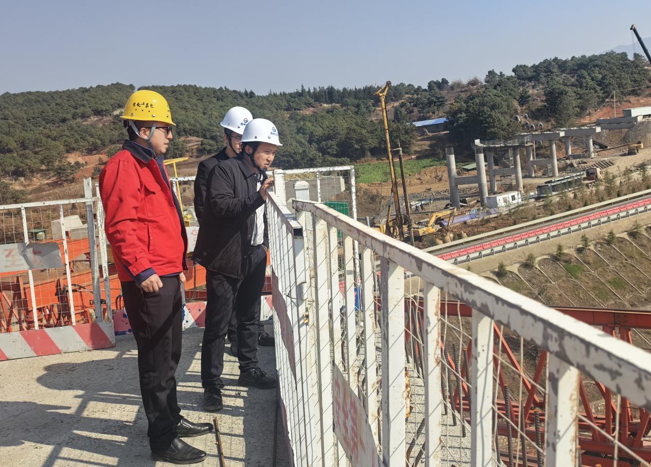 刘小飞深入桥梁架设、路基填筑、路面场站、龙潭互通等施工现场,详细了解项目施工进度、安全生产、成本管控及标准化施工落实情况。刘小飞强调,要牢固树立“8+2+1”的大安全观,针对山区高速施工的高边坡、深基坑、临时用电、特种设备等重大风险源,实现清单化、动态化管理,确保安全生产态势持续稳定可控;要狠抓工程计量,确保计量及时、准确、规范,加速资金回笼;针对工程变更,要建立健全变更立项、论证、审批的完整流程,确保程序合规、资料齐全;要紧盯年度目标任务,加强统筹调度,做好要素保障,科学优化施工组织,在保证质量和安全的前提下,全力以赴推进项目建设,确保高质量完成年度目标任务。