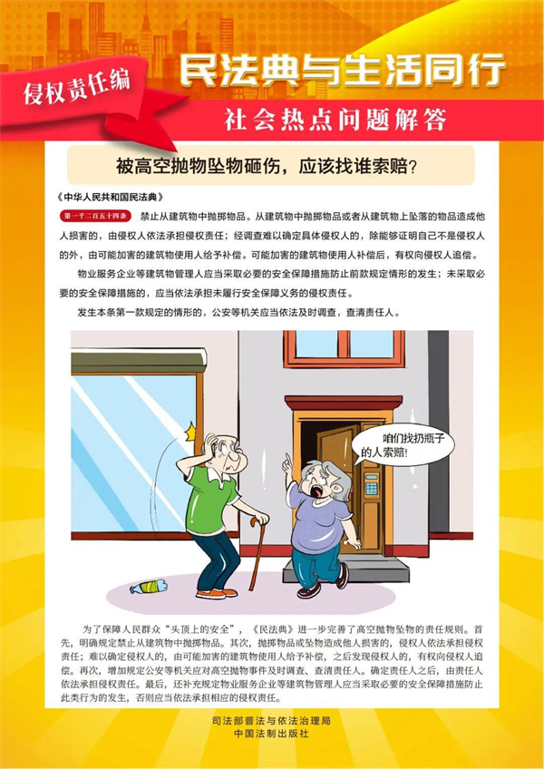 第1254条,高空抛物造成他人损害,由侵权人依法承担侵权责任。公安机关应当依法及时调查,查清责任人。