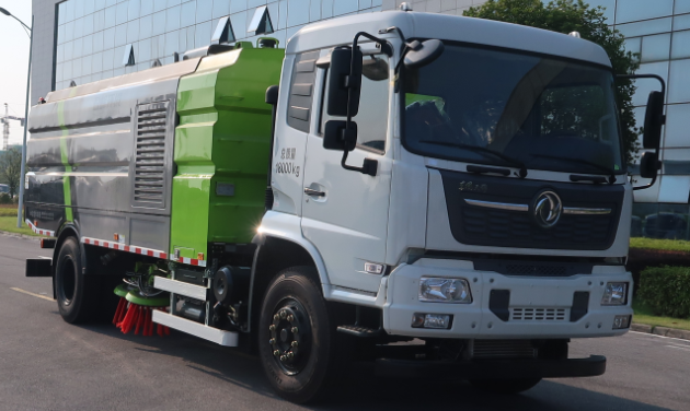 扫路车采用东风商用车有限公司的二类底盘改装,上装作业装置通过上装发动机驱动风机实现吸尘,驱动液压泵实现清扫等作业。该车采用吸扫结合、湿式除尘的工作原理对路面进行清扫、保洁作业,工作装置采用“中置四盘刷+后置吸嘴”的对称布置形式,方便道路左、右两边清扫。具有机动性能好、能耗低、噪声小、效率高、使用成本少、作业速度快等特点。