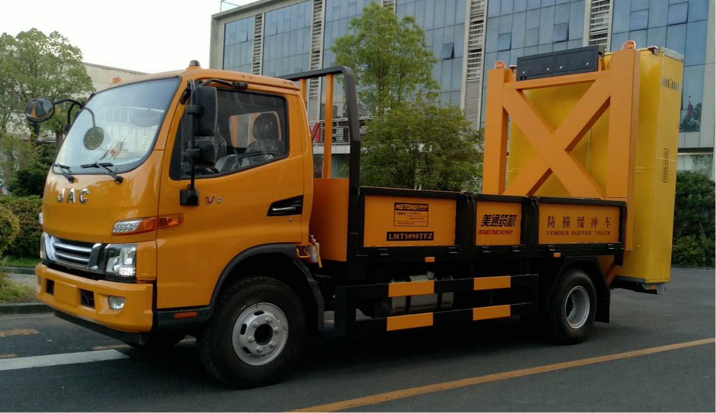 防撞缓冲车采用江淮汽车底盘、比利时原装进口的SE防撞包、导向标志以及LED显示屏组成。防撞缓冲车的防撞缓冲吸能模块是施工作业人员和施工车辆后方的缓冲卫士;如若发生追尾事故,能够在肇事车辆和前方施工作业区域之间构建一个缓冲区域,通过防撞缓冲车的防撞缓冲吸能模块吸收撞击的能量,从而最大限度地保护施工人员及设备。防撞缓冲吸能模块外壳采用轻质铝合金板材制造,中间填充有铝合金薄膜蜂窝吸能材料,受到碰撞将发生可控的变形从而有效地吸收碰撞能量,且该装置已通过欧盟CE认证。另外,该车标配大型诱导标示和LED显示屏,诱导箭头指示标志可对左、右及禁止通行进行导向指示;LED显示屏可显示各种符号或文字,告知驾驶人员前方道路情况。