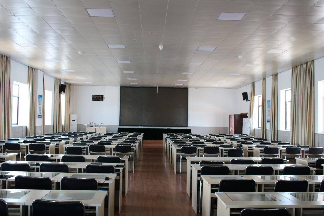 电教室面积450㎡,可容纳学员210人,配有独立光纤网络电脑200台,14㎡LED显示屏,教学音响一套,全覆盖的视频监控系统,智能人脸识别系统进入,适用于大型会议、各类管理人员培训考核。