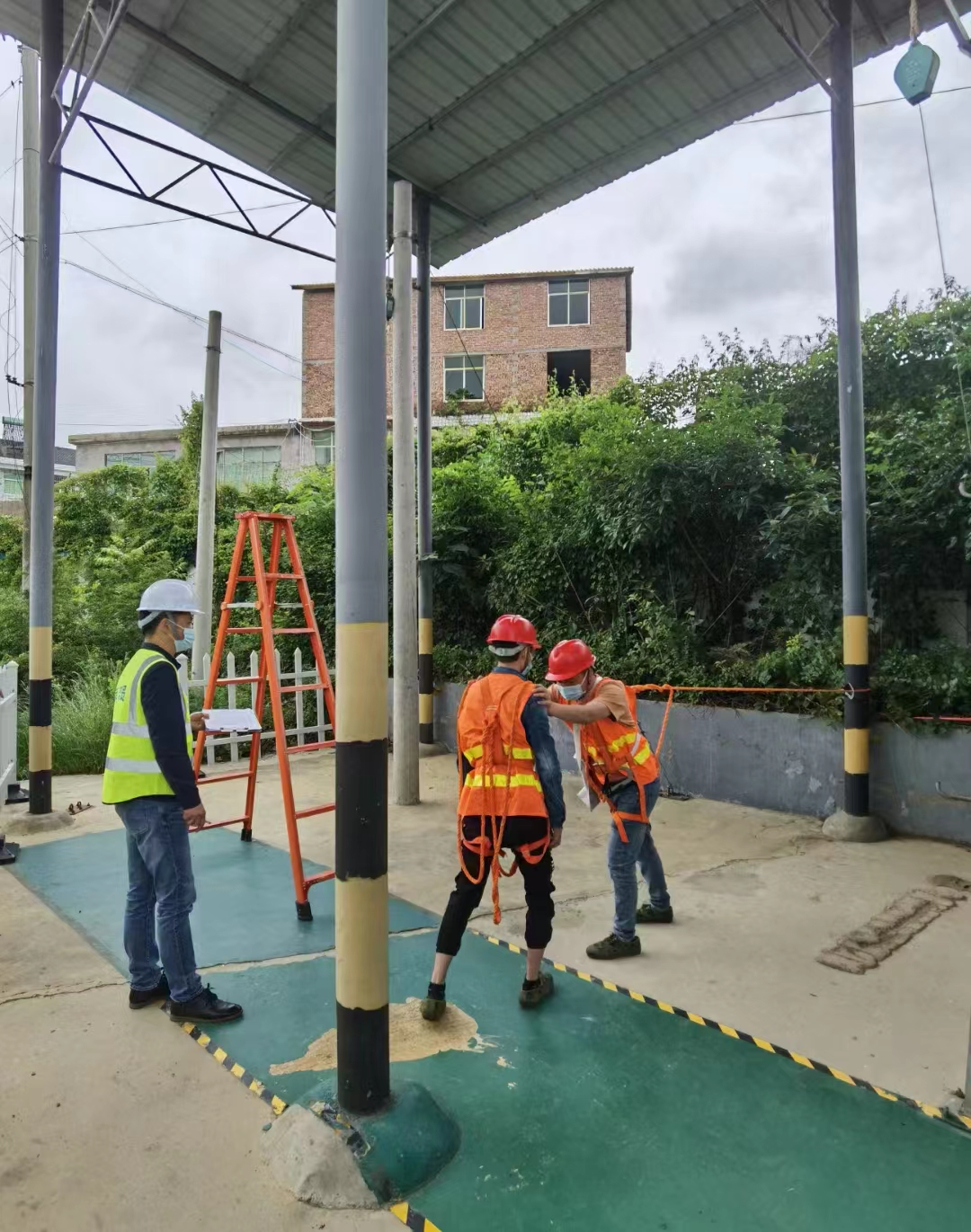图为学员在老师指导下进行高压电工练习和学员之间对安全带佩戴方式检查。此类培训适用于:公路、市政。