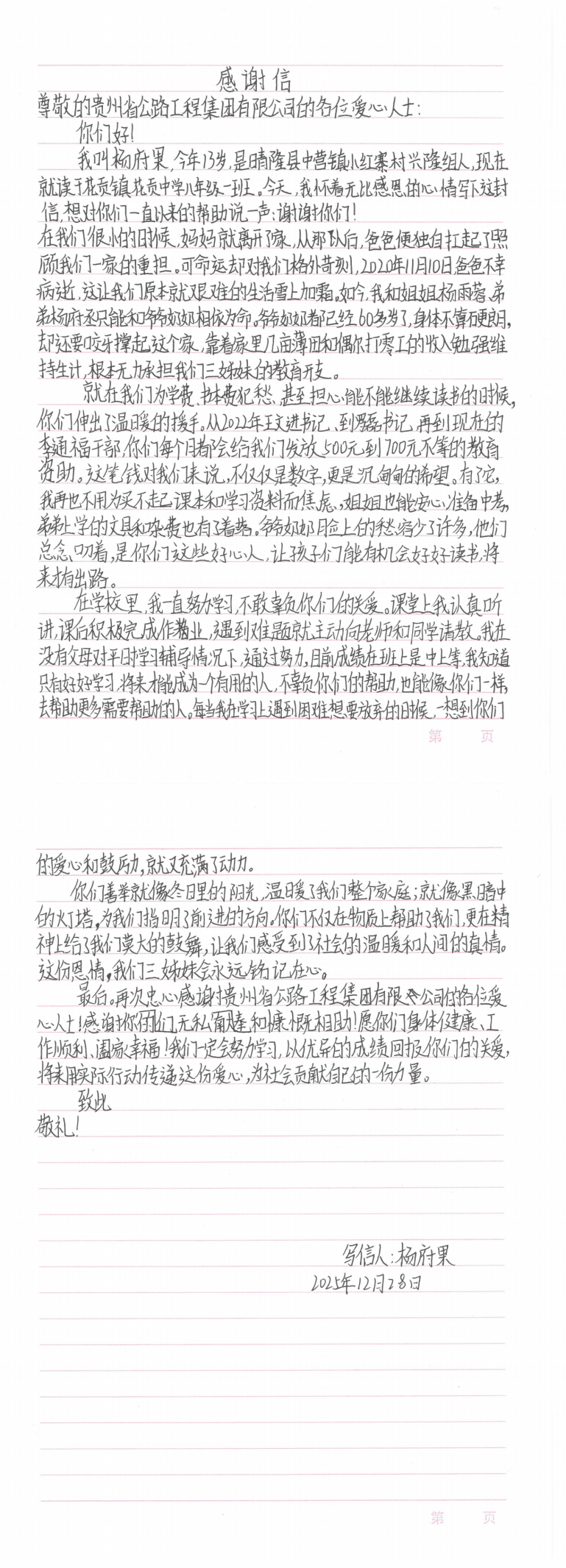 写信的女孩叫杨府果。五年前,她曾因家庭困难险些辍学,说话时总低着头;如今,在资助下她顺利读完小学,已成为花贡中学一名自信的初中生。这封信,不仅是一个女孩成长的告白,更是贵州公路集团五年来教育帮扶路上最温暖的见证。